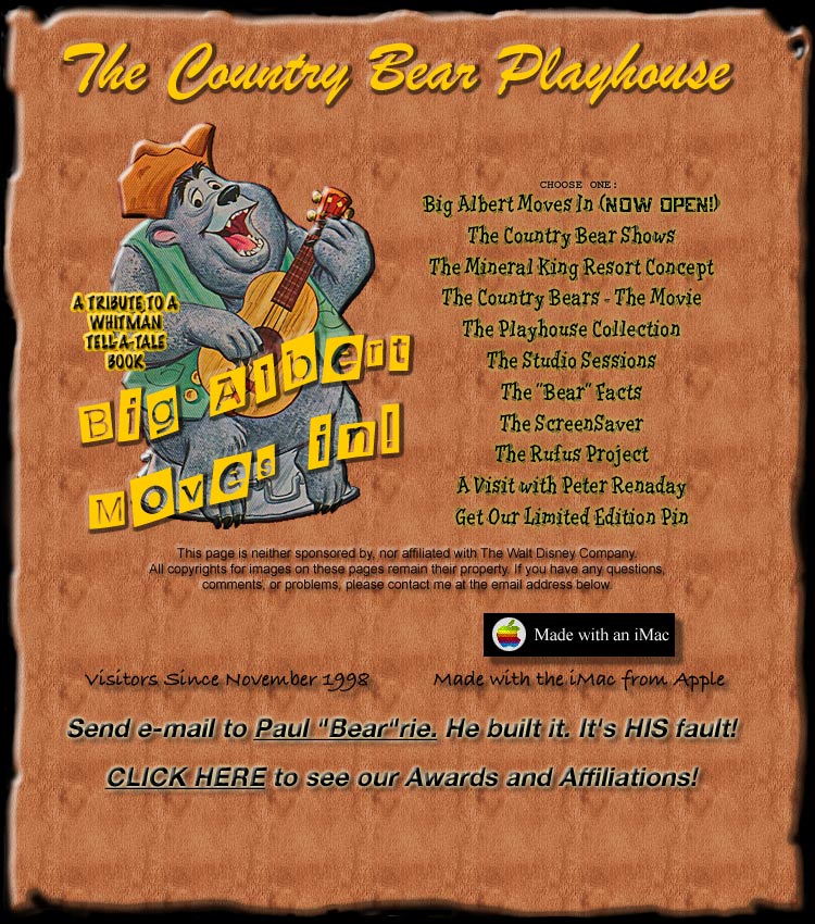 You like us... Send me a note Made with an iMac DV Special Edition THE UNSUNG HERO OF THE COUNTRY BEAR SHOWS A PC only ScreenSaver Learn about the bears Behind the Scenes Audio Now Open after a 2 year hiatus! The bears first major theatrical release The Resort Walt Never Built CLICK HERE TO CHOOSE WHICH SHOW YOU WANT TO EXPLORE Meet the voice of 'Henry the Bear' Only 100 pins! A 'MUST' for every true bear fan!